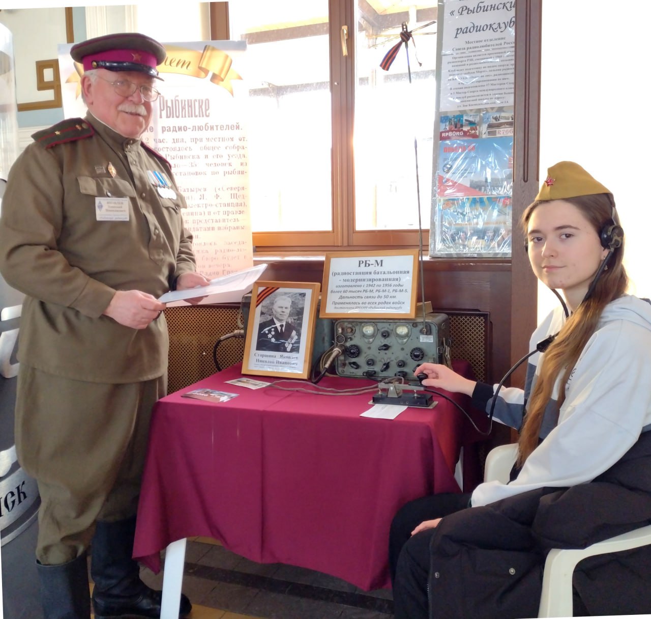 9 февраля «Поезд Победы» прибыл в город Рыбинск Ярославской области – Город трудовой доблести (R76GTD -2021 г.) На железнодорожном вокзале была организована торжественная встреча с участием артистов местной самодеятельности. Большое количество горожан пришло посмотреть исторические экспозиции в 9 вагонах этого состава. Внутри вокзала был развернут «штаб» с радиостанцией. На стенде общественной организации «Рыбинский радиоклуб» была представлена фронтовая радиостанция РБ-М с имитацией телеграфной работы, а также информация о клубе и баннер в честь 100-летия городской радиолюбительской организации. Рядом с радиостанцией, как бы частицей Бессмертного Полка, стоял портрет фронтового радиста Н.И. Яковлева, прошедшего боевой путь от Орши до Звенигорода, затем до Кенигсберга и участвовавшего в победе над Японией. Его сын Николай UA3MGA в форме времен Великой отечественной войны рассказывал гостям о данной радиостанции, особенностях военной радиосвязи, об «азбуке Морзе», о радиоспорте и работе клуба. Множество вопросов задавали как юные посетители мероприятия, так и взрослые.